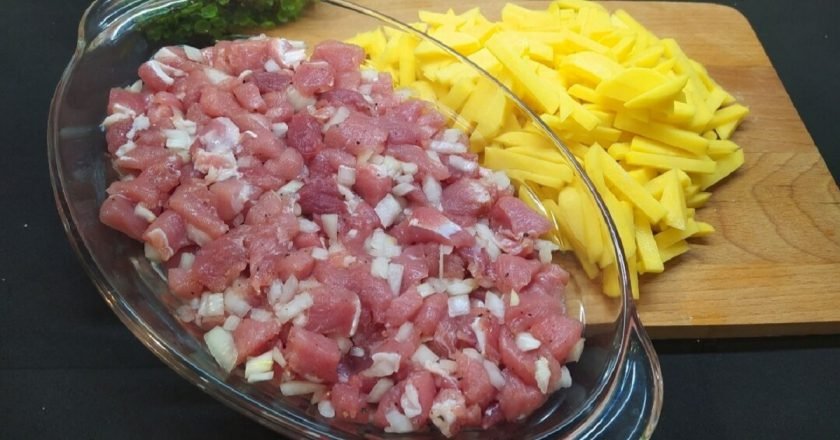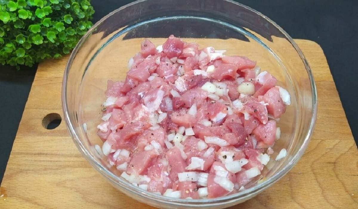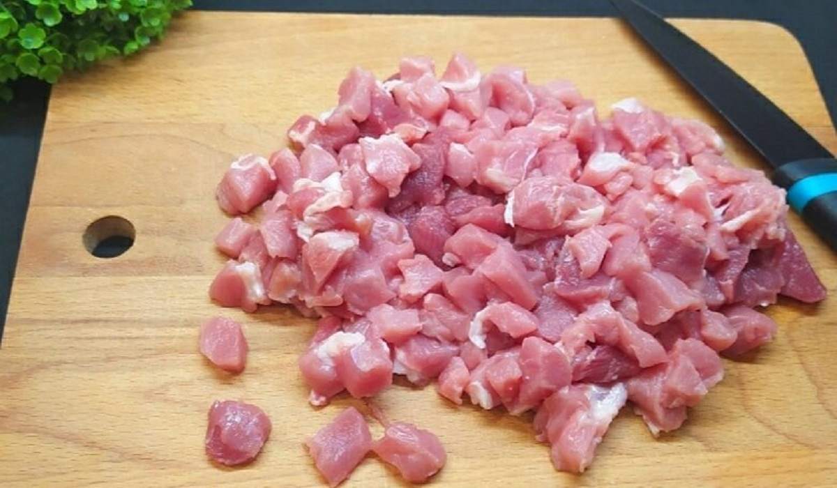 1.Dokładnie umyj i oczyść mięso, następnie pokrój je w kosteczkę.