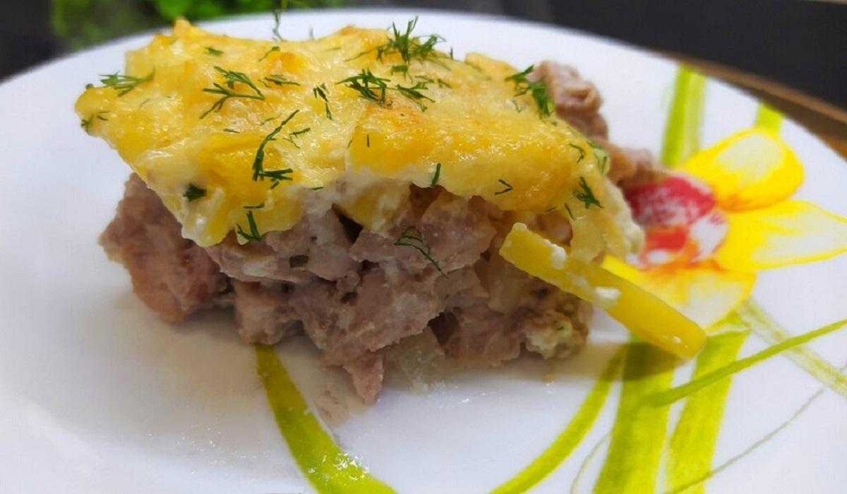 4. Wysmaruj masłem naczynie żaroodporne i przełóż do niego mięso. Na górę połóż pokrojone ziemniaki , posmaruj je majonezem i przykryj pokrywką.