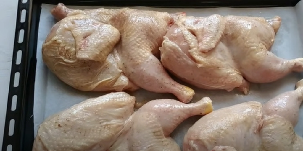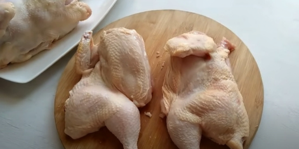 1.Z umytego oraz wysuszonego kurczaka wytnij szyjkę oraz końcówki skrzydeł. Następnie na pół przekrój kurczaka. W małej miseczce wymieszaj olej, sól oraz pieprz.