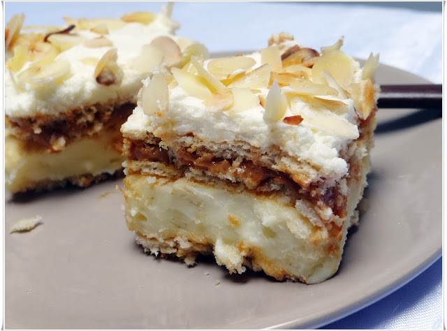 5. Teraz układaj warstwami: Najpierw krakersy, potem zimna masa budyniowa, kolejna warstwa krakersów, kajmak, bita śmietana i prażone migdały. Gotowe!