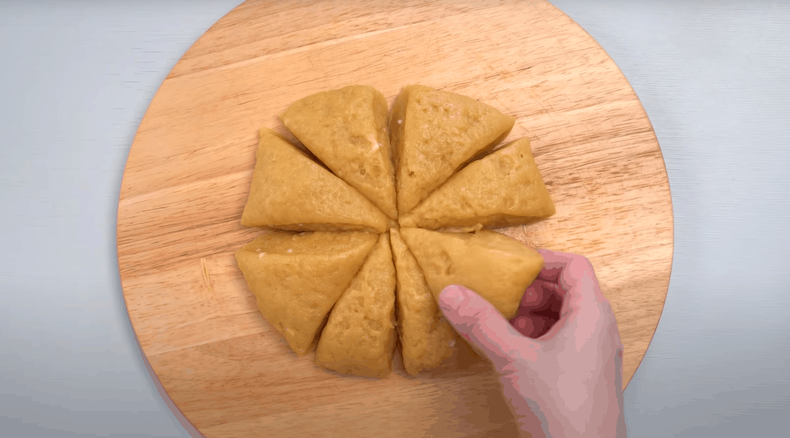 Kiedy zwartość garnka zacznie się pienić, wsyp odrobinę mąki i znowu wymieszaj. Następnie zdejmij garnek z ognia i ostudź. Do schłodzonej masy dodaj resztę mąki i zagnieć ciasto. Kiedy będzie już gotowe, podziel je na osiem równych części.