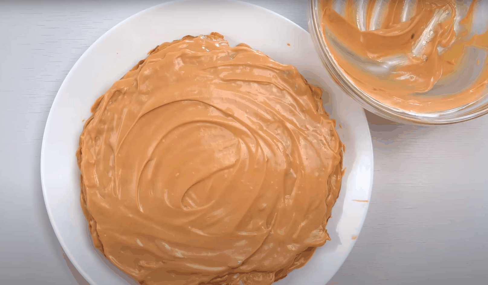 Wszystkie kawałki rozwałkuj i smaż pojedynczo na rozgrzanej i suchej patelni, na małym ogniu przez ok. 2 minuty z każdej strony. Następnie przygotuj krem – połącz skondensowane mleko ze śmietaną i powstałą masą posmaruj każdy placek, układając je jeden na drugim. Na wierzchu powinna być warstwa kremu.