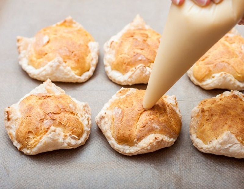 9. Napełnij gotowe kieszonki kremem za pomocą szprycy. Przed podaniem posyp kieszonki cukrem pudrem.