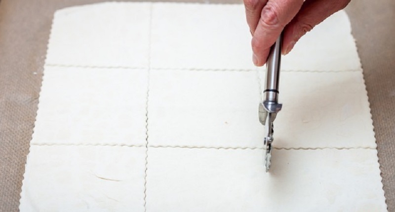 4. Rozwałkuj arkusze wcześniej rozmrożonego ciasta francuskiego (powinnaś dostać arkusze o wym. 30 x 30 cm.). Następnie pokrój je na małe kwadraty o szerokości 10 cm.
