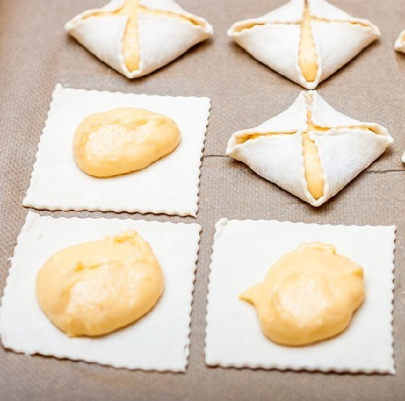 5. Umieść łyżkę ciasta francuskiego zrobionego wcześniej, na środku każdego kwadratu i zawiń wszystkie rogi tak, jak pokazano na zdjęciu. Piecz gotowe koperty w piekarniku przez 50–60 minut w temperaturze 180 stopni.
