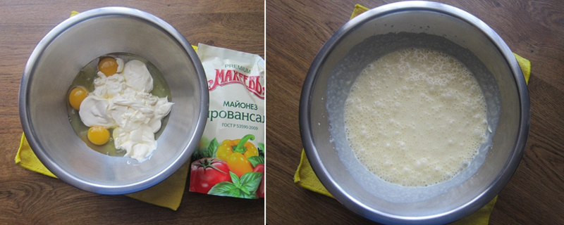 1.W wysokiej misce połącz ze sobą jajka, majonez, sól, cukier waniliowy oraz cukier. Do tak przygotowanych składników powoli wlewaj wodę , całość bardzo dokładnie połącz ze sobą.