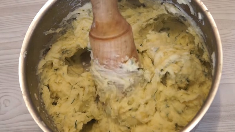 6. Do ugotowanych ziemniaków dodaj masło, cebulę, posiekany koperek i ugnieć na puree.