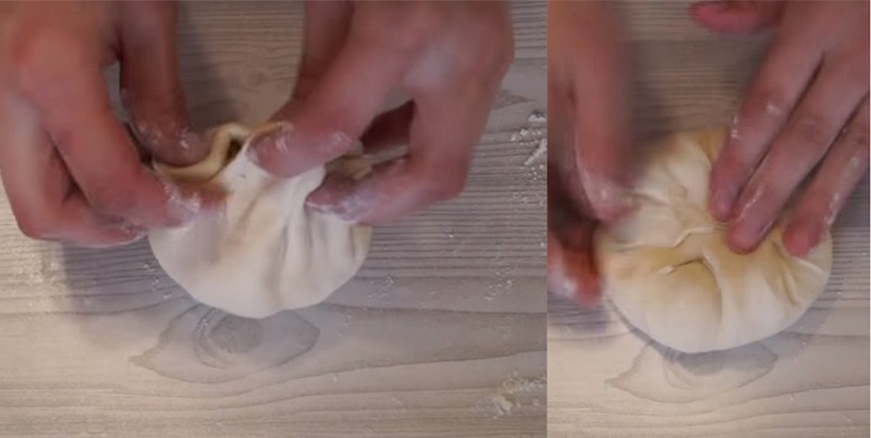 11. Zawiń szczelnie nadzienie w cieście i dociśnij palcami, aby się nie rozkleiło. Potem delikatnie rozwałkuj kulki do grubości ok. 2-3 mm. Miękkie i lekko ciepłe ciasto będzie lepiej rozwałkować z nadzieniem.