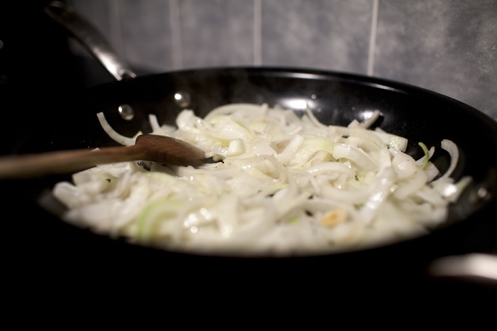 3.Jedno część podsmaż na patelni z dodatkiem drobno posiekanej cebuli przez 3-4 minuty. Do drugiej części cukinii dodaj jajka, dokładnie połącz ze sobą te dwa składniki.