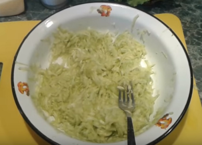 1.Za pomocą tarki zetrzyj na dużych oczkach obraną oraz umytą cukinię.