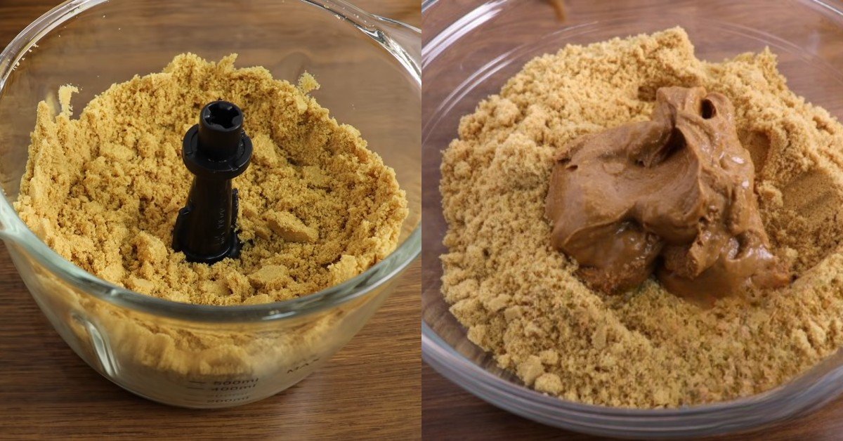 1.Za pomocą blendera zmiel ciastka, przesyp je do wysokiej miski, następnie dodaj orzechowe masło i ugnieć dokładnie dłonią. Masa powinna być lekko wilgotna oraz miękka.