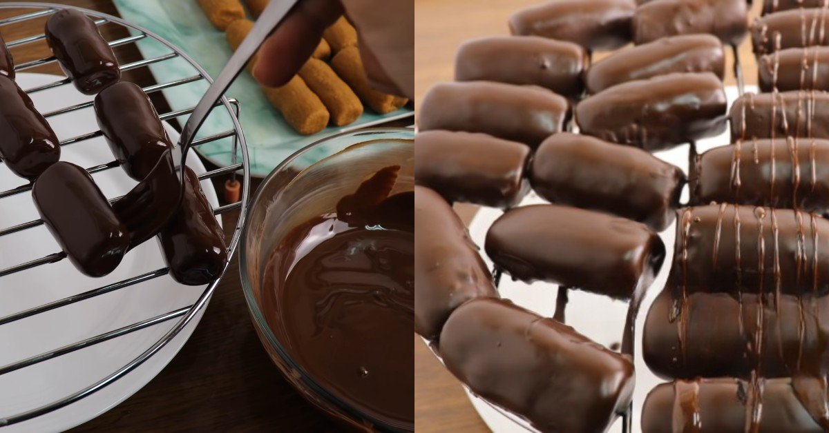 4.Po kolei zanurzaj ciasteczka w rozpuszczonej czekoladzie i kładź je na kratce, aby spływał nadmiar czekolady. Do całkowitego stężenia odstaw. To wszystko!