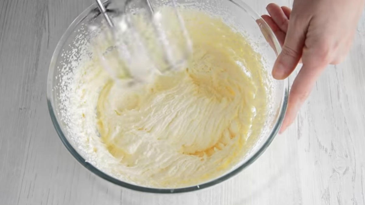 Do miski przekładamy masło, cukier i sól, a następnie miksujemy przez 5 minut.