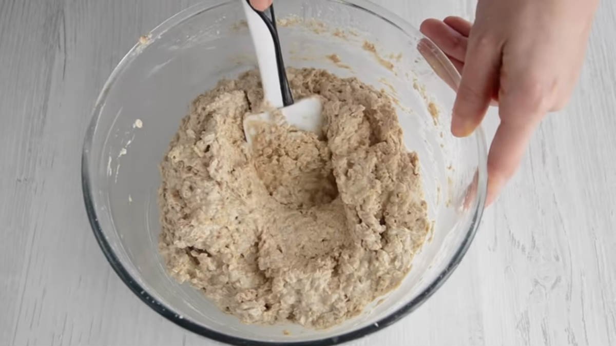 Dodajemy po jednym jajku miksując, aż masa uzyska jasny kolor i gładką konsystencję. Do drugiego naczynia wsypujemy mąkę, płatki owsiane, proszek do pieczenia i cynamon.