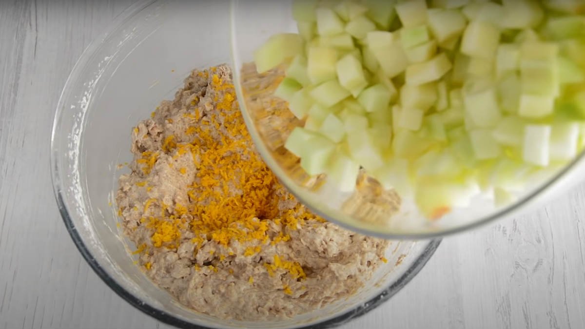 Dokładnie mieszamy, a następnie dodajemy płynną masę i dokładnie mieszamy, aż będzie jednolita masa. Powinna być ona miękka. Jabłka obieramy i kroimy w drobną kostkę. Skrapiamy sokiem z cytryny, a jej skórkę ścieramy na tarce i dodajemy do ciasta wraz z jabłkiem.