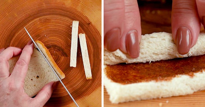 1. Z 4 kromek chleba tostowego, odetnij skórkę. Następnie, rozwałkuj je tak cienko, jak tylko jest to możliwe.