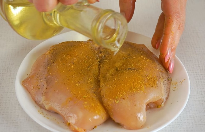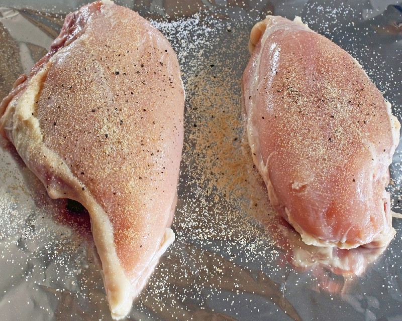 1. Posyp piersi z kurczaka swoimi ulubionymi przyprawami oraz pieprzem i solą do smaku.