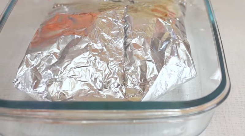 6. Zamarynowaną pierś w przyprawach, zawiń w folię tak, aby podczas pieczenia nic nie wyciekło.
