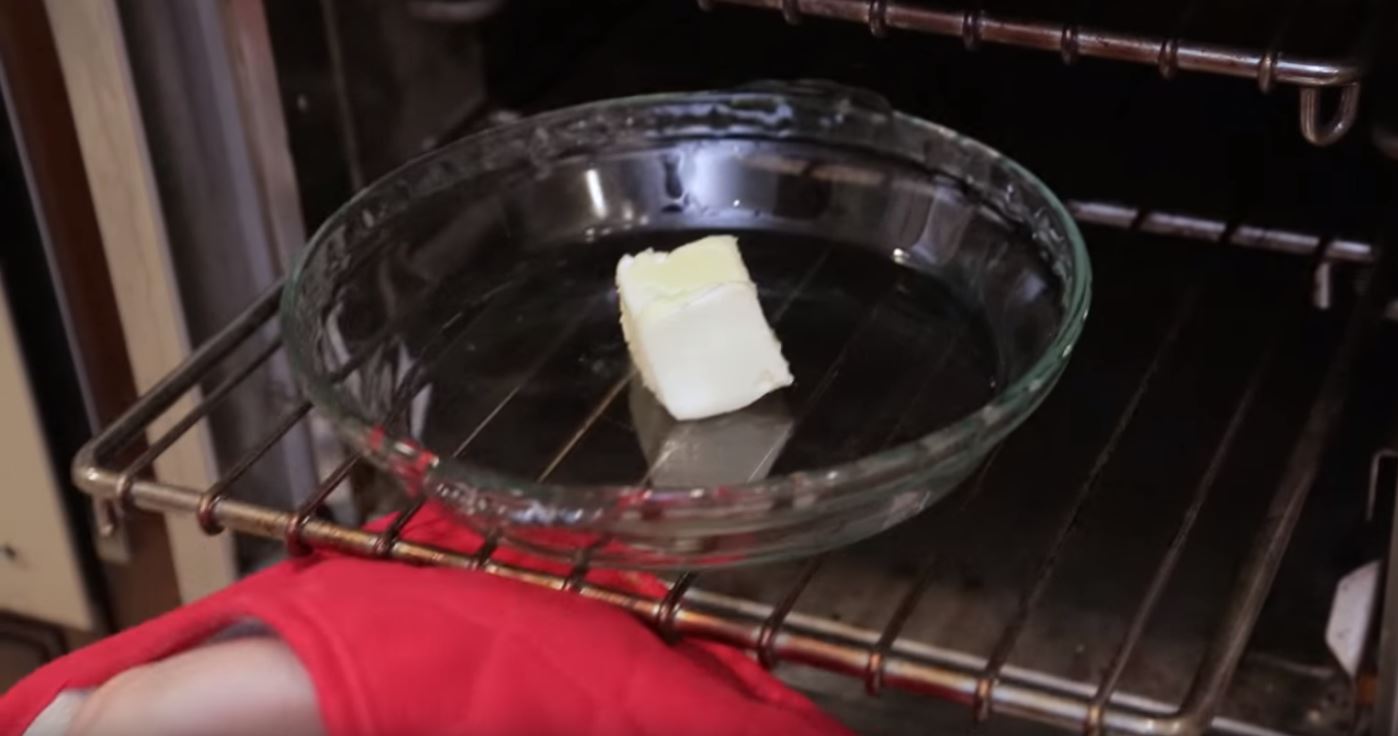 Masło roztapiamy. Najlepiej i najszybciej zrobić to w piekarniku nastawionym do 220 stopni w naczyniu żaroodpornym.