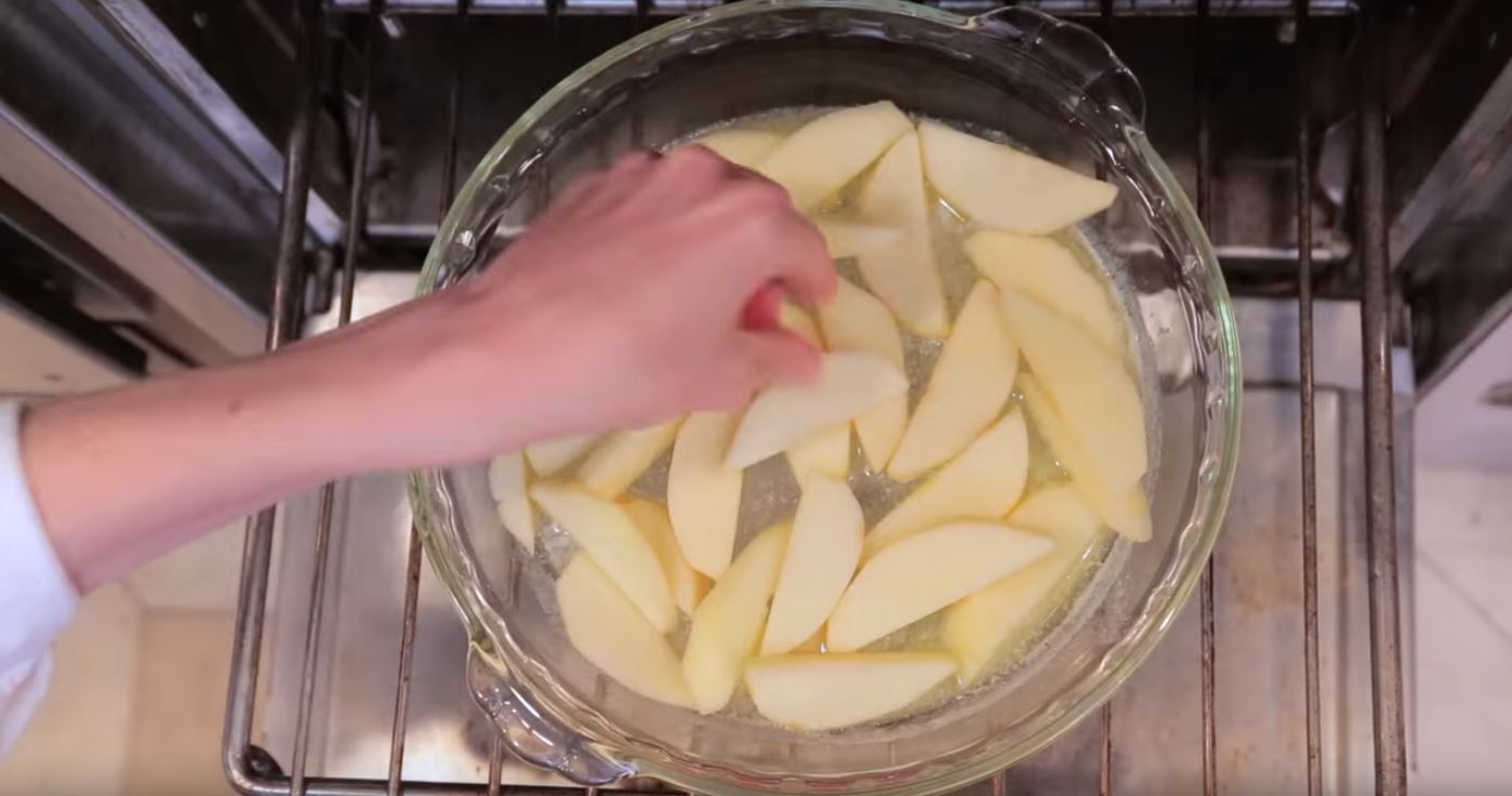 W tym samym naczyniu żaroodpornym, w którym znajduje się roztopione masło układamy plasterki pokrojonych jabłek.