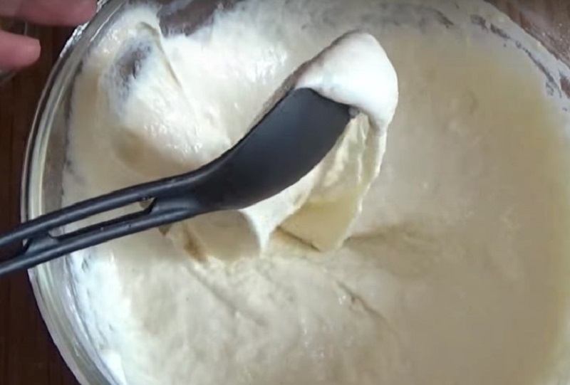 1. Kefir wymieszaj z sodą oczyszczoną i solą, a następnie dodaj cukier oraz małymi porcjami mąkę. Wymieszaj składniki na jednolite, gładkie ciasto o konsystencji gęstej śmietany i gotowe odstaw na 5 minut.