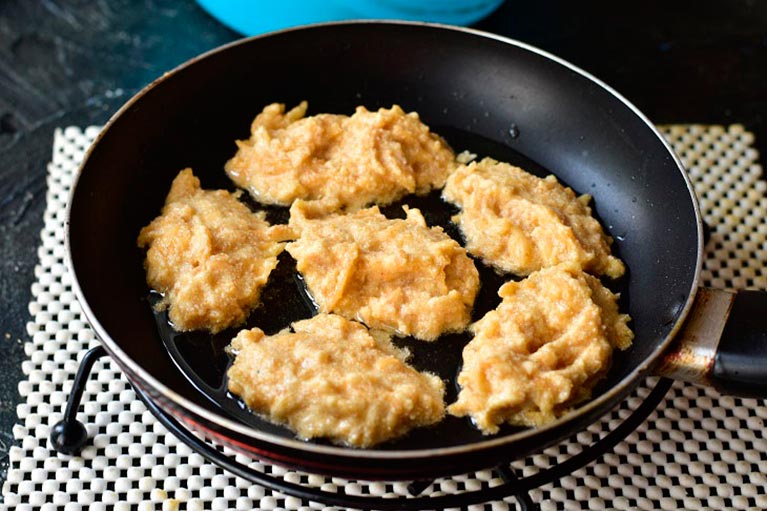 4. Na rozgrzanej patelni smaż placuszki na małym ogniu z obydwu stron, aby mieć pewność że placuszki są dobre po obróceniu je na drugą stronę przykryj pokrywką patelnie na kilka minut. Placki będą chrupiące i złociste.