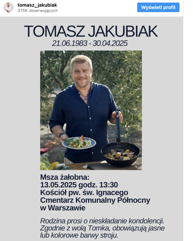 „Tomasz Jakubiak 21.06.1983 – 30.04.2025. Msza żałobna odbędzie się 13 maja 2025 roku o godzinie 13:30 w Kościele pw. św. Ignacego w Warszawie. Po mszy świętej nastąpi odprowadzenie na Cmentarz Komunalny Północny.”