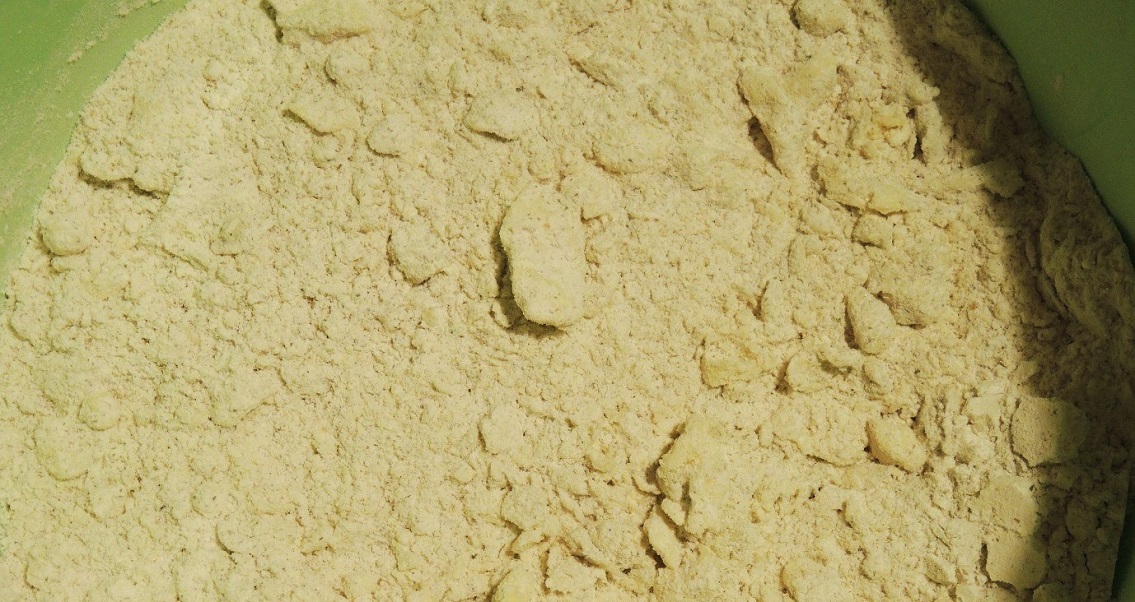 1. Na początku uszykuj dużą miskę, do której przesiej mąkę pszenną z dodatkiem proszku do pieczenia. Dodaj pokrojone w drobną kostkę masło i całość dokładnie wymieszaj.