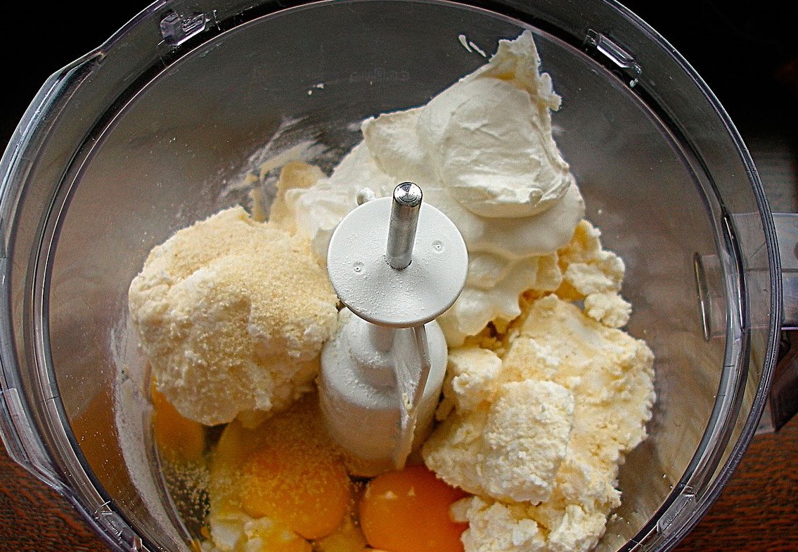 3. Do osobnego naczynia wbij jajko, dodaj śmietanę, resztę cukru, twaróg oraz cukier wanilinowy. Wszystkie składniki dokładnie wymieszaj do momentu powstania jednolitej masy.