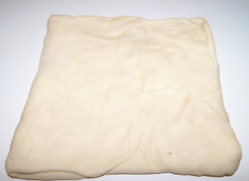 3. Teraz zwiń drugą część ciasta o tej samej średnicy, nasmaruj olejem. Umieść pierwszy kawałek ciasta w uformowanym kwadracie z pierwszego kawałka. Umieść na papierze pergaminowym i przechowuj w lodówce przez dwie godziny. Z pozostałymi kawałkami ciasta zrób to samo. W rezultacie otrzymujesz 2 kwadratowe kawałki ciasta.