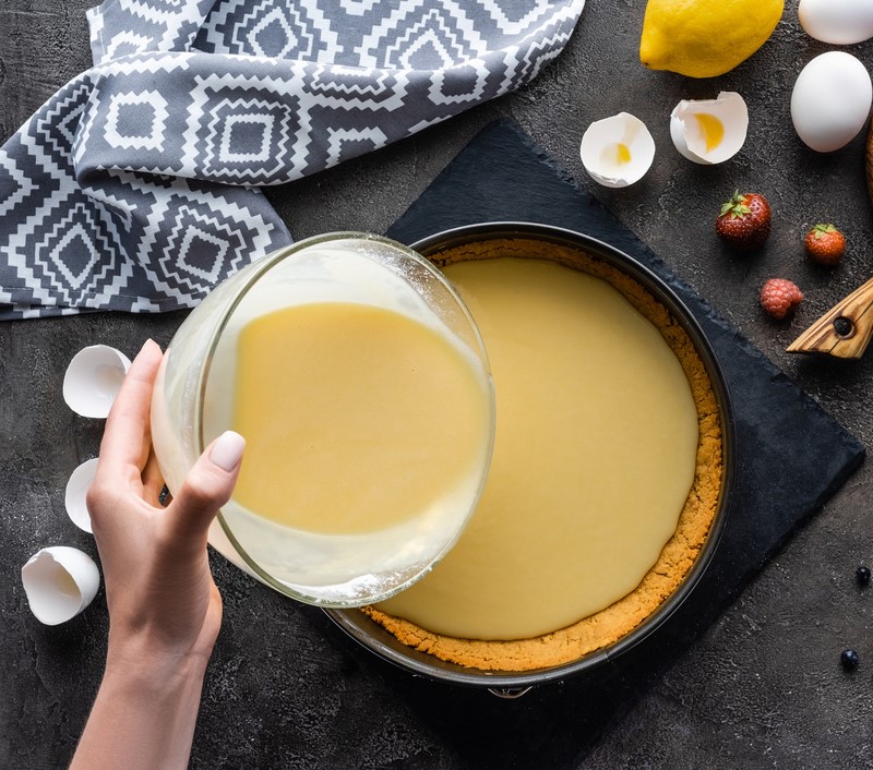 6. Weź jeden kwadrat zamrożonego ciasta rozwałkuj i przełóż na blaszkę obłożoną papierem do pieczenia. Warstwa powinna być nieco większa niż patelnia, aby można było tworzyć małe boki. Teraz wylej krem na ciasto.