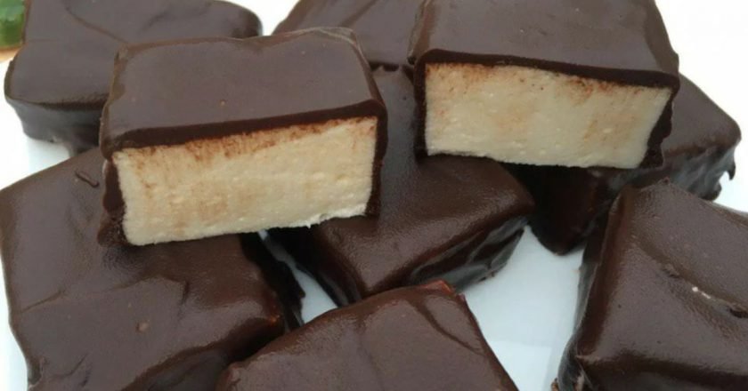 6. Rozpuść w kąpieli wodnej czekoladę (możesz dodatkowo dodać kostkę masła – masa będzie delikatniejsza). Teraz, schłodzone i stężałe ptasie mleczko, pokrój w kosteczkę, każdą zanurz w czekoladzie i poukładaj na papierze do pieczenia do całkowitego zastygnięcia. Potem wstaw do lodówki na 20 minut. Gotowe!