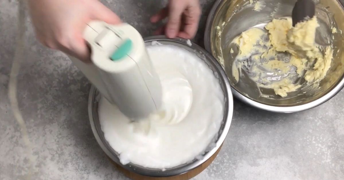 4. W osobnej misce, ubij masło i stopniowo dolewaj mleko skondensowane. Teraz, małymi porcjami dodawaj ubite masło z mlekiem do ubitej piany i mieszaj, aż piana stanie się lekko płynna, a składniki połączą się ze sobą.