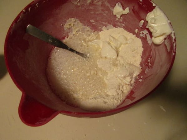 1.W misce połącz ze sobą mąkę, sól oraz proszek do pieczenia. Następnie dodaj roztopione masło, oraz śmietanę, powoli wlej łyżkę sprite.