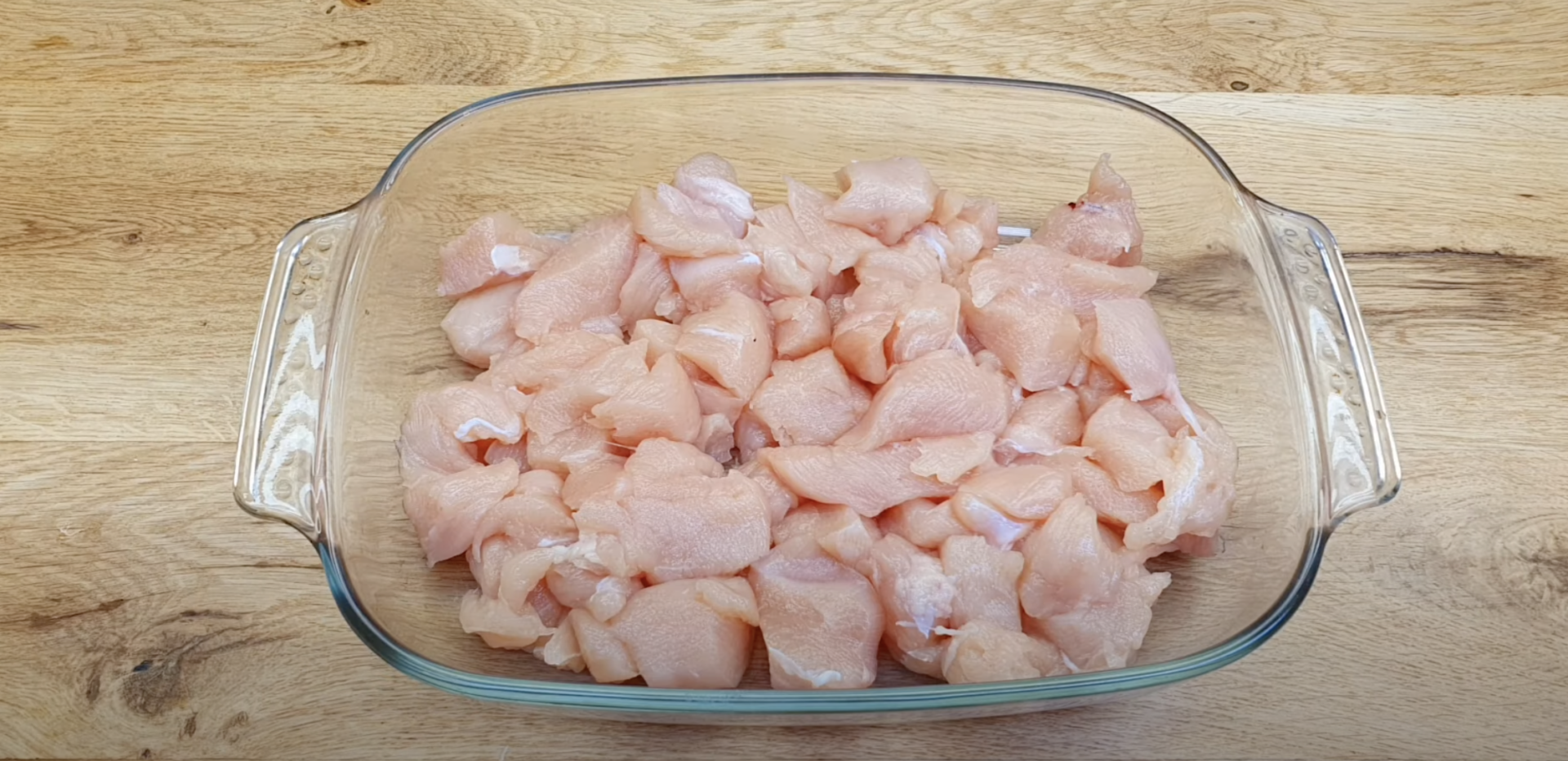 1.Na samym początku oczyszczoną pierś z kurczaka pokrój w małą kosteczkę, po czym przypraw ją solą i dokładnie całość wymieszaj.