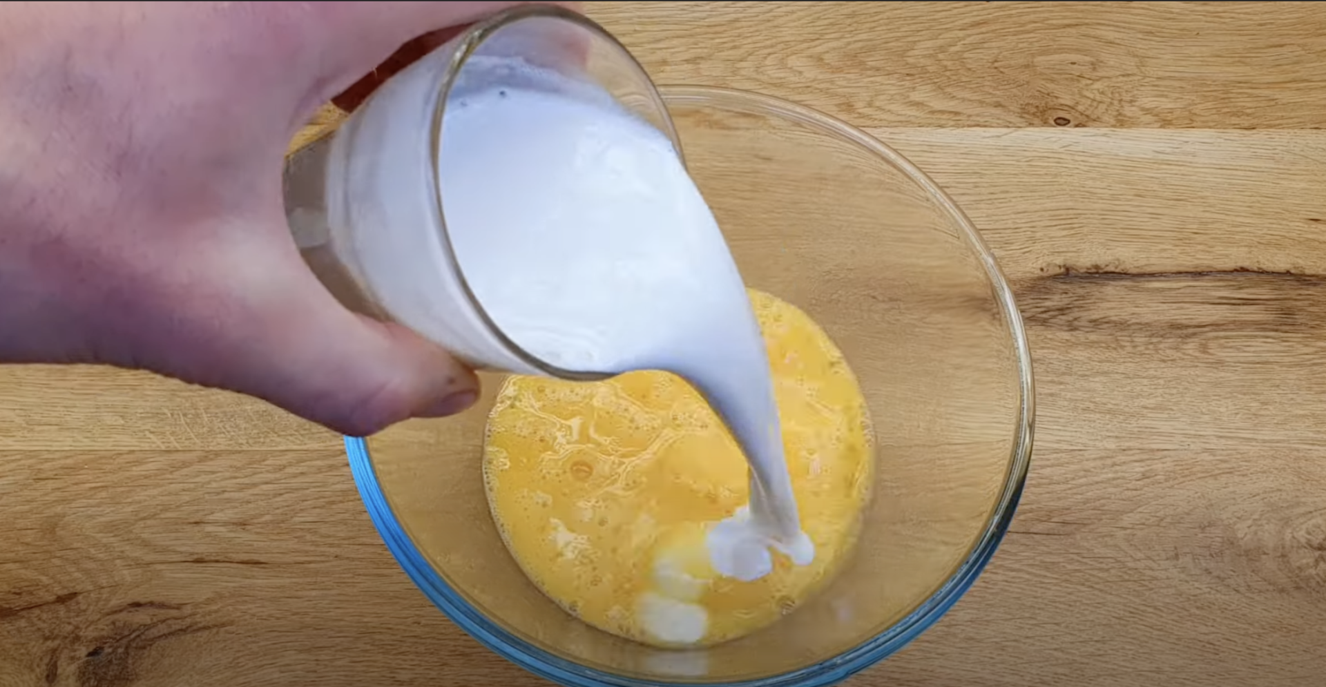 3.W misce wymieszaj ze sobą jajka, śmietanę oraz wszystkie pozostałe przyprawy. Podczas przygotowania sosu, dodaj również przeciśnięty przez praskę czosnek.