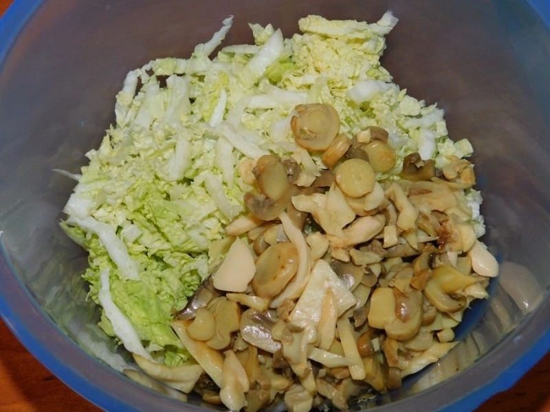 Na samym początku rozgrzej piekarnik do 180 stopni po czym piecz w nim przyprawionego kurczaka do momentu, aż będzie miękki. Upieczone mięso, koniecznie pokrój na mniejsze kawałki. Obrane pieczarki pokrój na małe kawałki. Rozgrzej oliwę na patelni i smaż na złocisty kolor pieczarki. Umyte pomidorki pokrój na pól, następnie drobno poszatkuj kapustę.