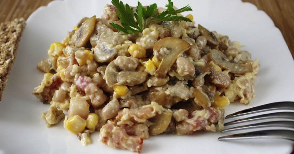 Na patelni podsmaż pokrojone w plasterki pieczarki. Następnie na osobnej patelni podsmażaj pokrojona w plasterki szynkę. Za pomocą tarki zetrzyj na małych oczkach ser. Przez praskę przeciśnij ząbki czosnku. Wszystkie składniki przełóż do miski razem z odcedzoną kukurydzą oraz fasolą. Całość wymieszaj z musztardą , jogurtem oraz ulubionymi przyprawami.