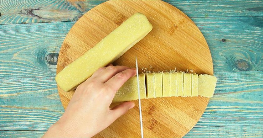 6. Po tym czasie, wyciągnij ciasto i pokrój je na plastry o grubości 1 cm.