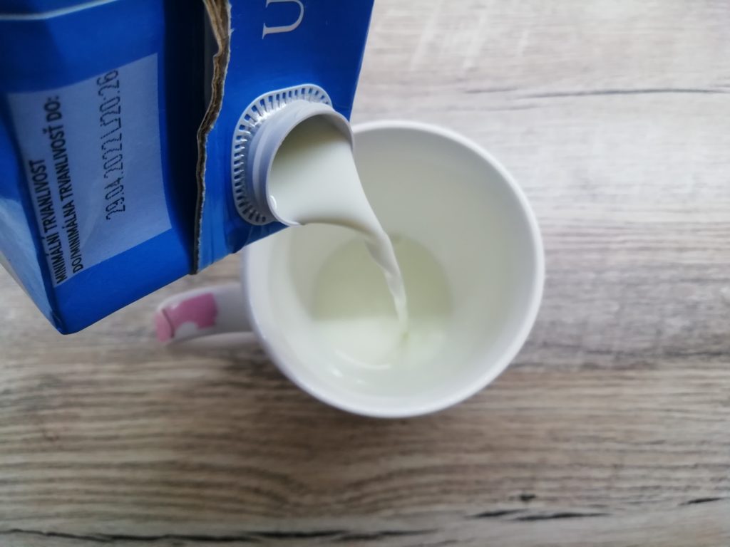 5.Do szklanki wlej mleko oraz olej. Następnie dodaj także odrobinę przygotowanego ciasta, po czym dokładnie wymieszaj i przelej z powrotem do miski. Delikatnie całość wymieszaj.