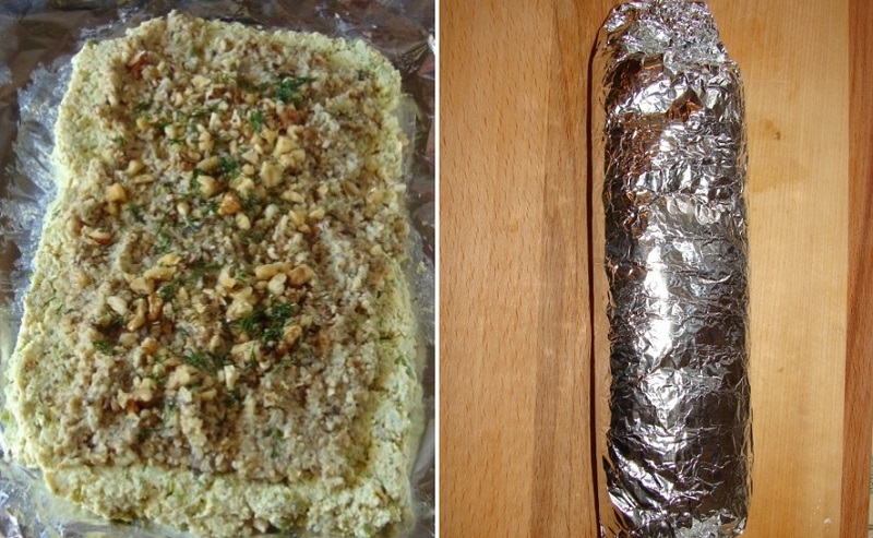 4.Rozłóż folię aluminiową lub spożywczą , następnie ułóż na niej warstwę z mięsa oraz groszku ( 1-1,5), po każdej stronie zostaw około 2 cm wolnego miejsca. Następnie wyłóż przygotowany farsz z pieczarek, posyp orzechami oraz ziołami.