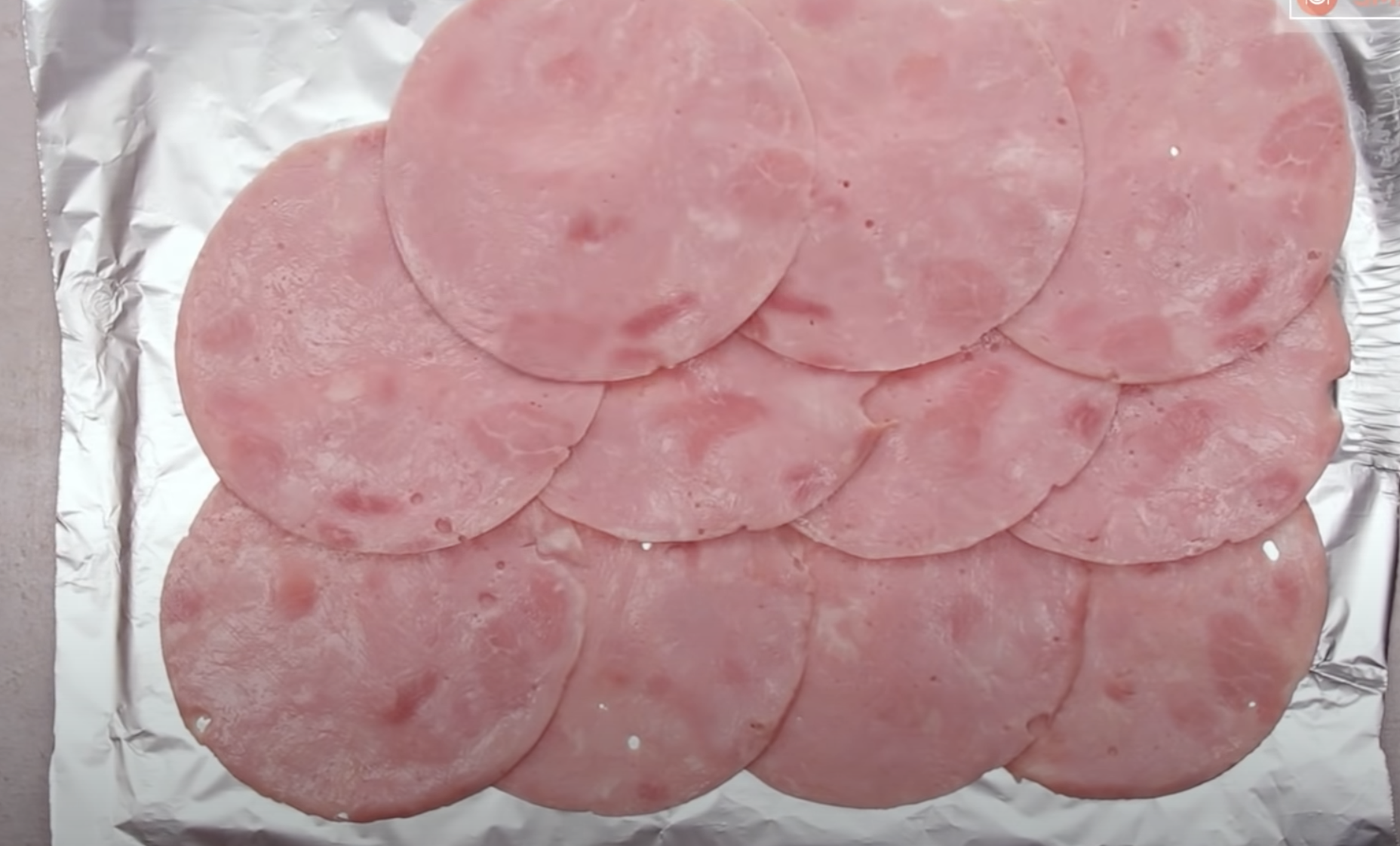 2.Na przygotowanej foli poukładaj szynkę , tak aby plasterki na siebie nachodziły.