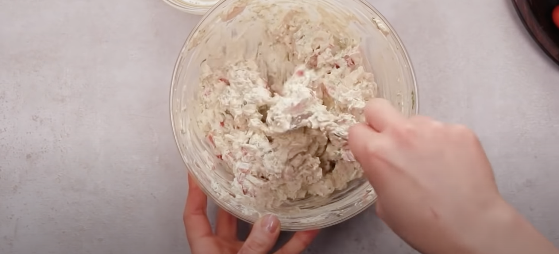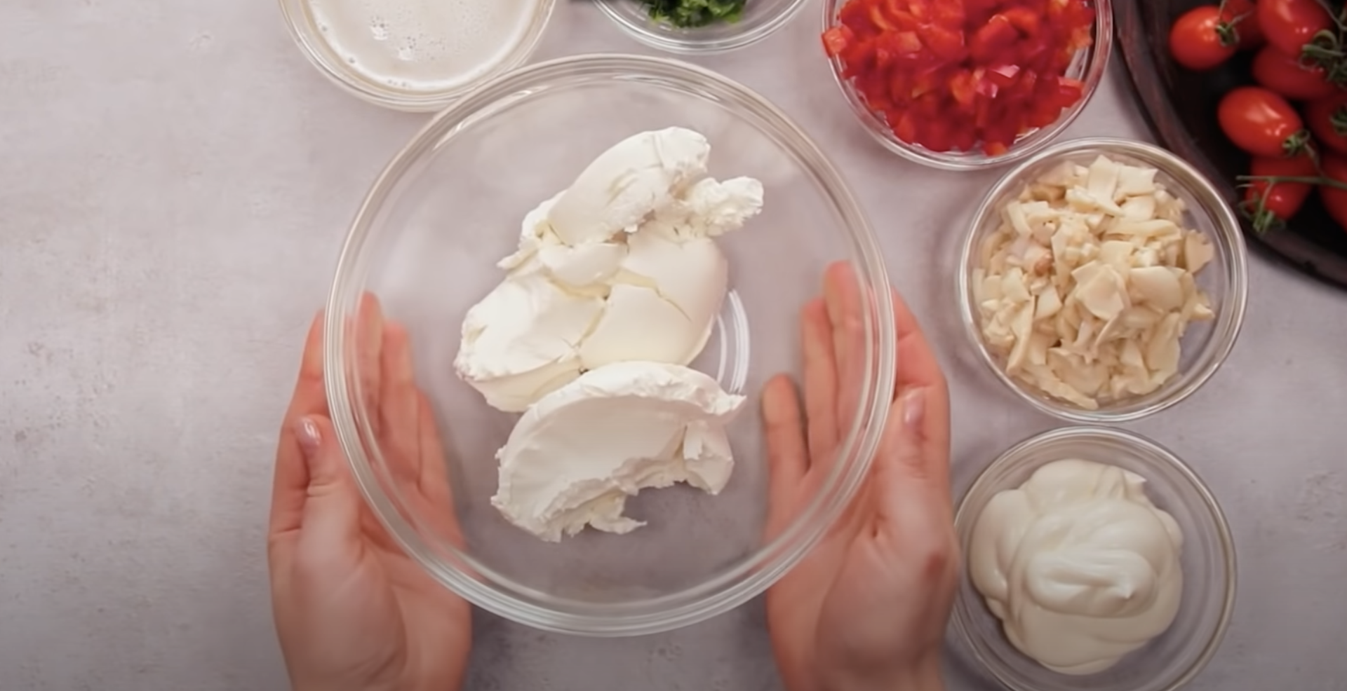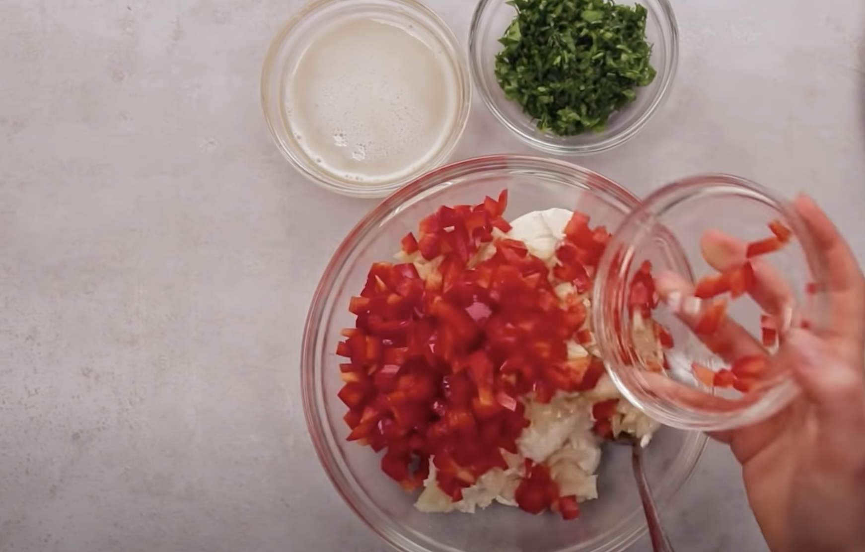 4.Następnie dodaj marynowane pieczarki, pokrojoną drobno paprykę oraz posiekane zioła. Całość dokładnie wymieszaj.