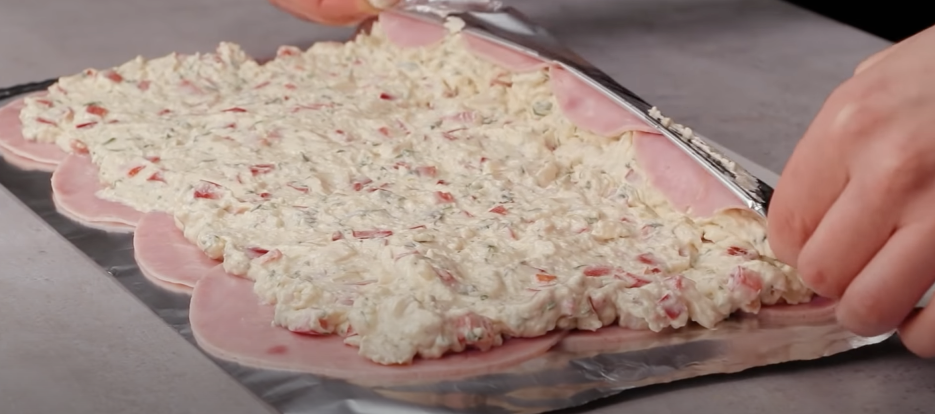 6.Gotowe nadzienie nakładaj na przygotowane szynkę, następnie zwiń ciasno w rulon.