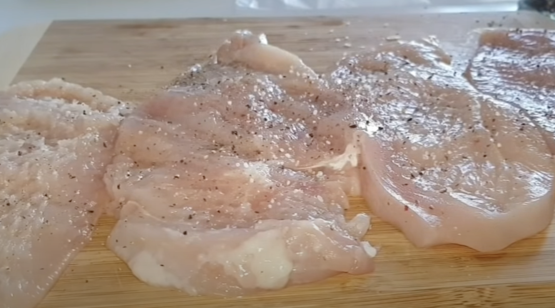1.Na samym początku dokładnie umyj kurczaka po czym używając ręczników papierowych osusz mięso. Tak przygotowanego fileta, pokrój na cienkie plasterki.