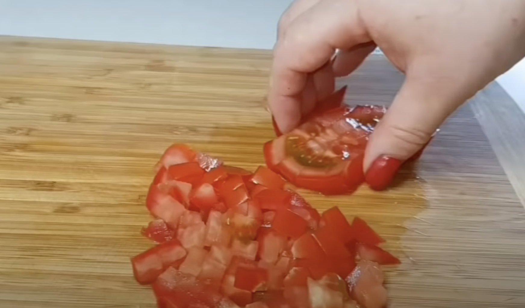 2.Starannie przypraw mięso solą, pieprzem oraz ziołami. Tak przygotowane mięso przechowuj w lodówce przez pół godziny. W tym czasie pokój umytego pomidora w kostkę.