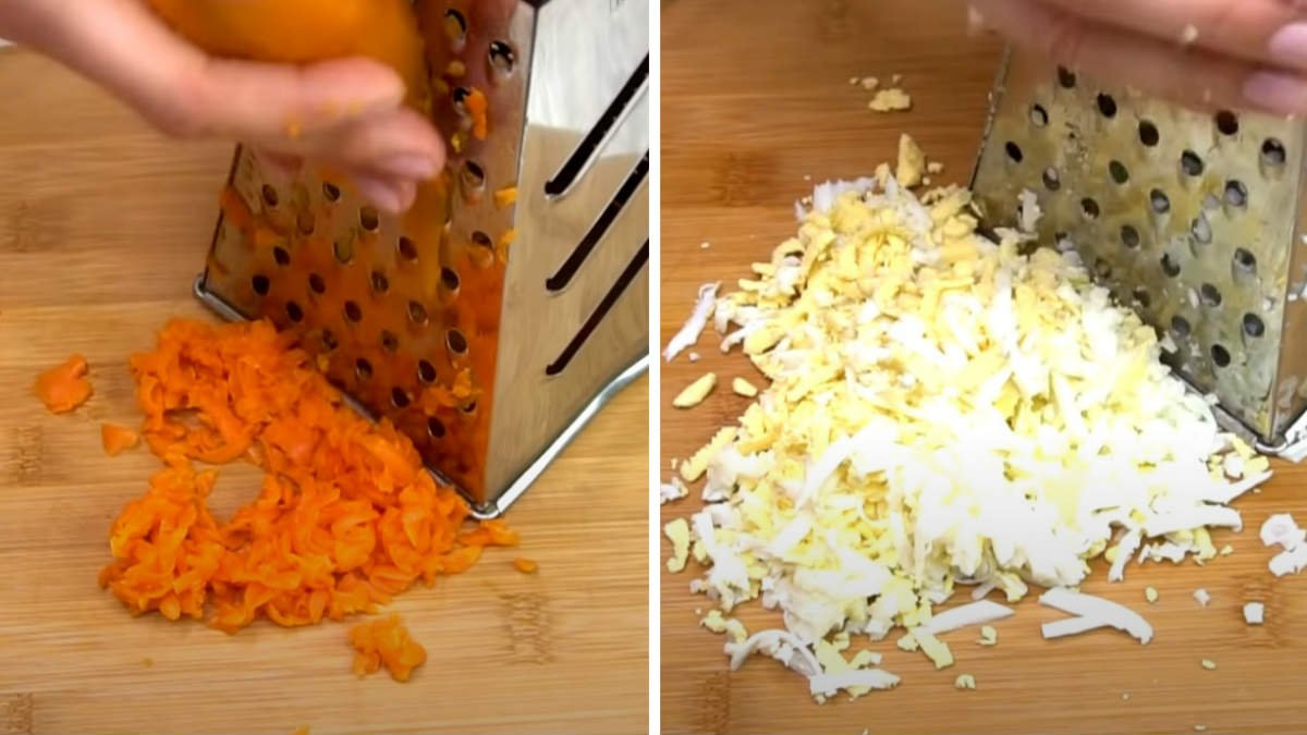 1. Jajka ugotuj na twardo, ziemniaki i marchewkę ugotuj do miękkości, a następnie wystudź i zetrzyj na tarce o grubych oczkach.