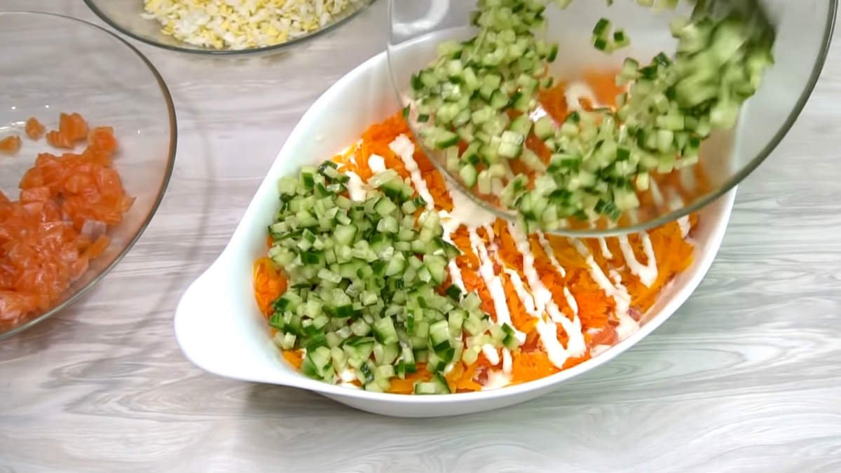 2. Łososia pokrój w kosteczkę i delikatnie posól, ogórka pokrój w drobną kostkę. Sałatkę układaj warstwami: ziemniaki, połowę łososia, marchewka, ogórek, jajka. Każdą warstwę z wyjątkiem łososia, posmaruj majonezem.