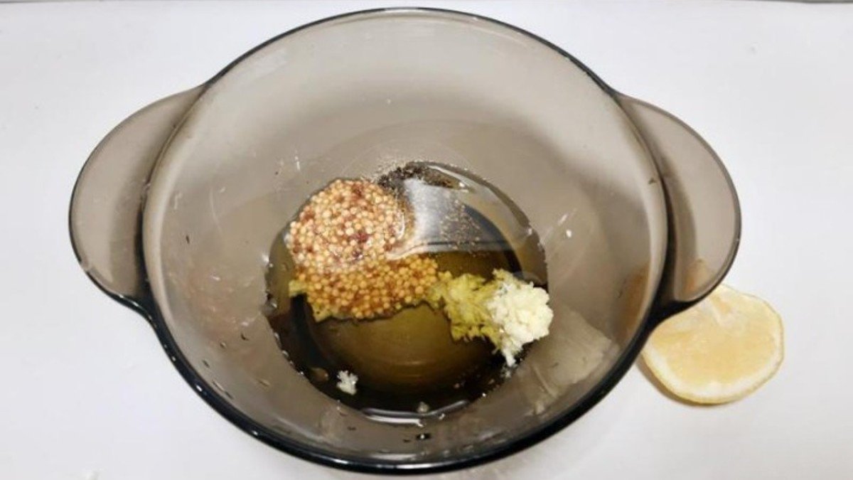 1. W misce, wymieszaj oliwę z oliwek, ocet winny, cukier, musztardę, sól, pieprz i przeciśnięty przez praskę czosnek. Gdy składniki połączą się ze sobą – odstaw na 20 minut.