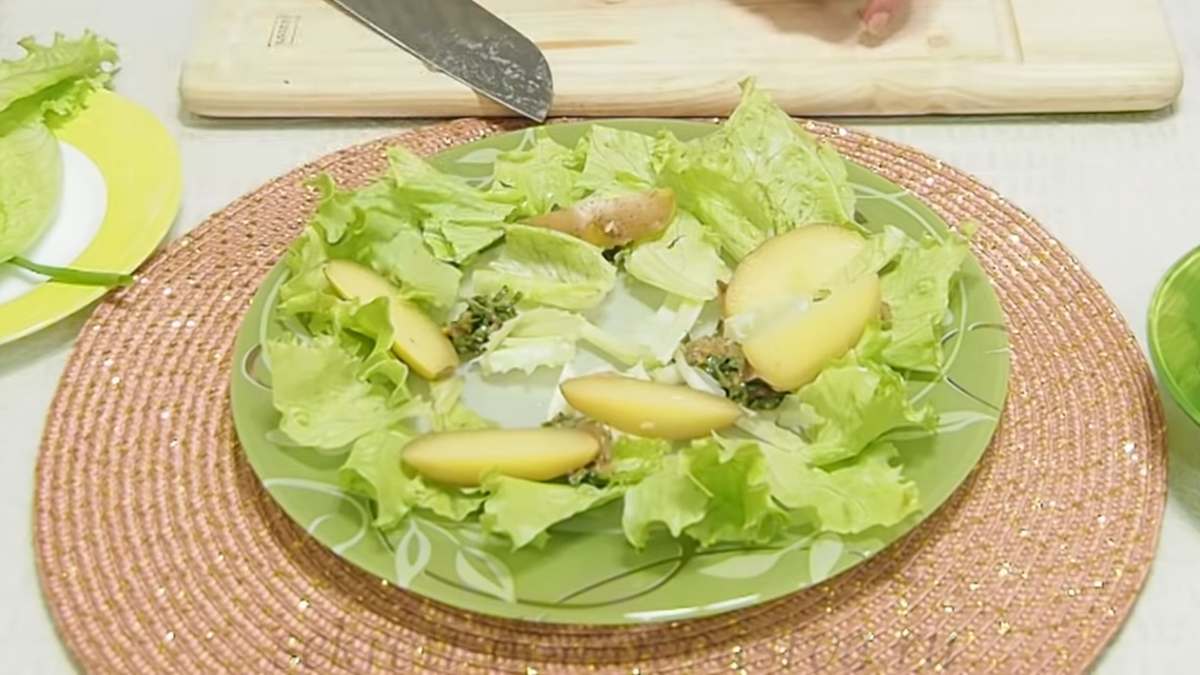 3. Na talerzy do serwowania, ułóż liście sałaty i skrop octem winnym, potem na brzegu talerza układaj pokrojone w talarki ziemniaki i jajka, a pomidorki koktajlowe przekrojone na pół.